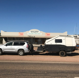 DAY 36 FULLARTON RIVER REST AREA TO WINTON (282km) We continued along the Landsborough Highway. We stopped at the town of McKinlay where the famous Walkabout Creek Hotel from Crocodile Dundee is. Then drove through Kynuna to arrive in Winton for the night. Camped at the camp ground attached to the pub. We went to the Waltzing Matilda Centre and the Musical Fence.